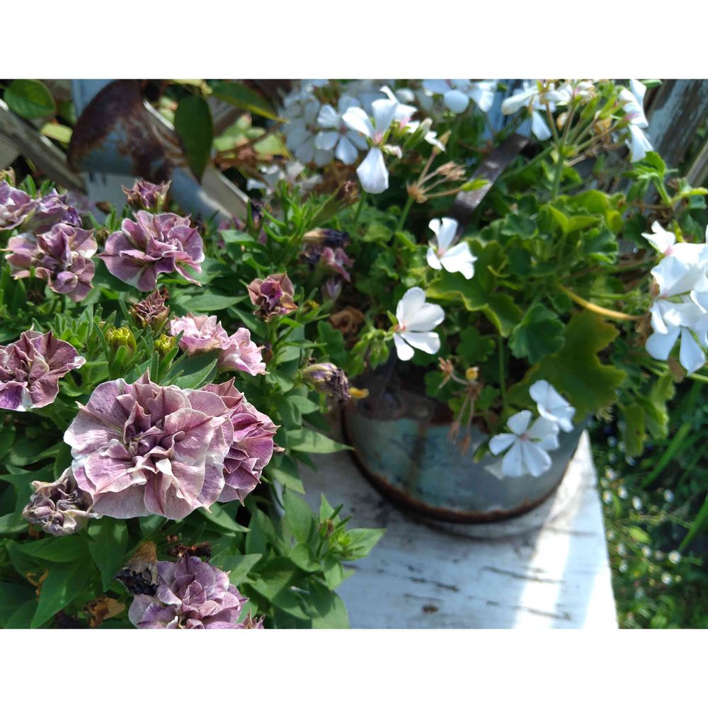ペチュニアジュリエット モダンホワイトとゼラニウムマルカダホワイトです♪