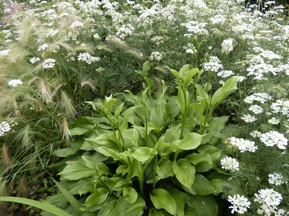 6月頃、オープンガーデンでオルレアに囲まれたギボウシの葉っぱ🌿たちを見かけました。