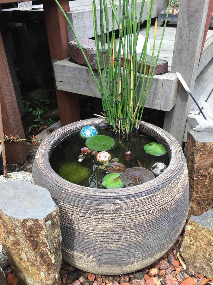 6年前に設置、焼き物の鉢は植物にもメダカにも良いみたいです。