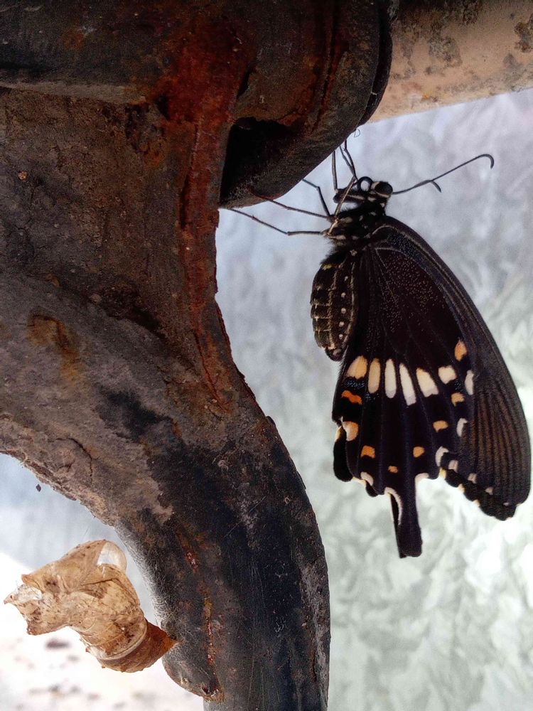 廃車(バイク)の下で羽化したばかりのアゲハチョウ🦋