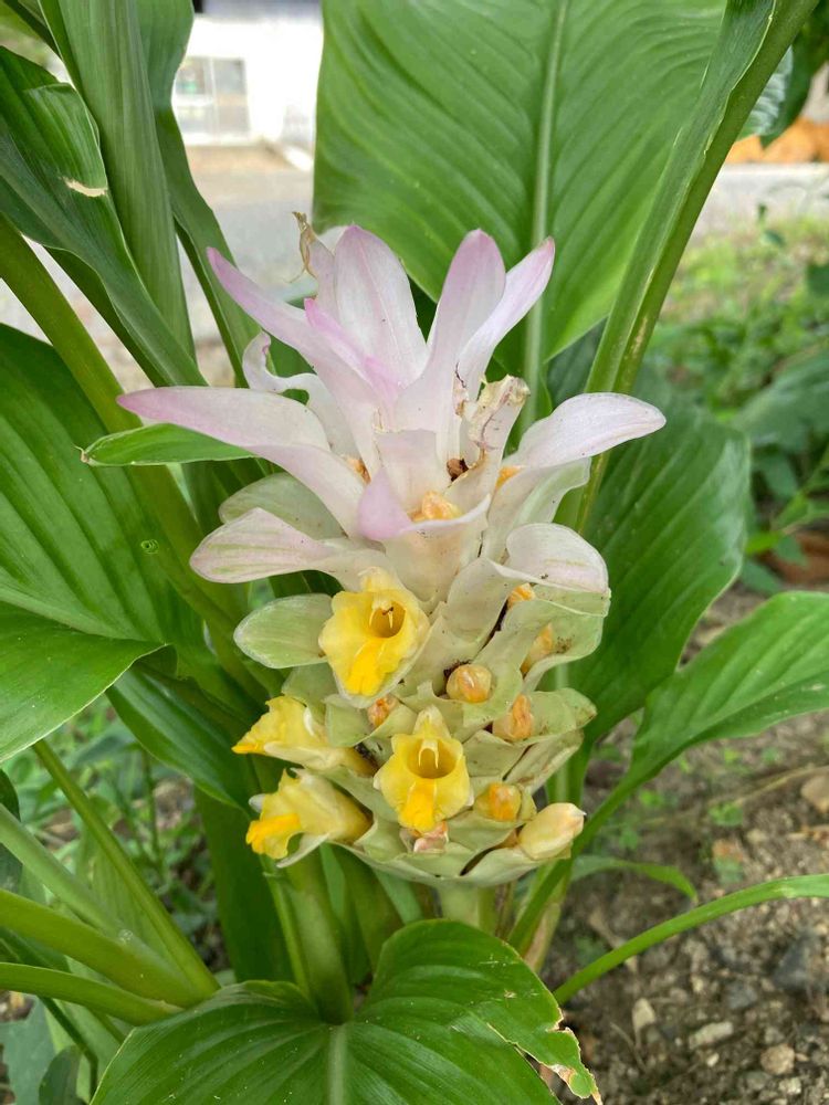 ウコンかなと。綺麗な花ですね😍わが家も畑をやってる友達に頂き、数年植えてましたが、どんどん増えて、ウコンの根っこを収穫して、料理に使いました。👌