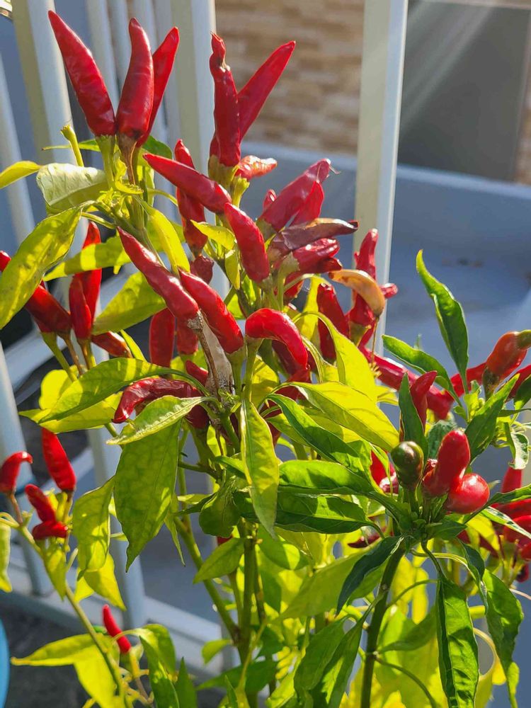 知らぬ間に落ちた実がプランターにヒット、1年後所狭しと唐辛子だらけの苗が育ちました。😅