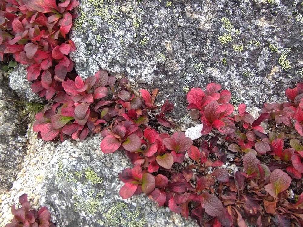 花崗岩の亀裂にしっかり根を下ろして。花が咲くのも早いが、色付くのも早い!網目の葉が独特 2022.8.30 南ア鳳凰山観音岳