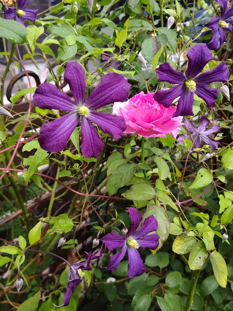 クレマチス ギャロルとシェエラザードが仲良く咲いています💞