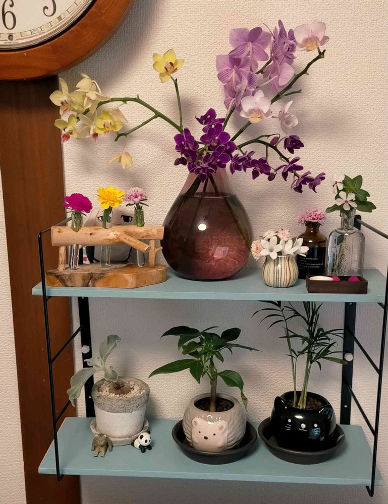 だんだん涼しくなってベランダの花たちも活気を取り戻してきました✨というわけで、咲いていた花たちを摘んで飾ってみました☺️母が買った蘭を囲んでゴージャスに✨下の段は観葉植物エリアになっています😉