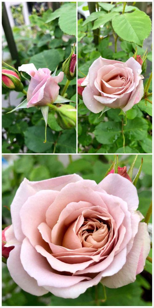 和ばらのいおりさん、左上が昨日の朝、右上が今日の朝、下がさっき撮ったpicデス🌺カフェオレ色のシブいお姿(*´ω`*)花びらの中を覗くと、ほんのり黄色も。