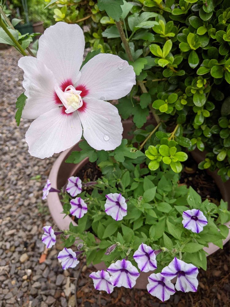 ムクゲの花が、咲いてくれました。スパーチュニアと、御一緒に!😅🌞🥳💁