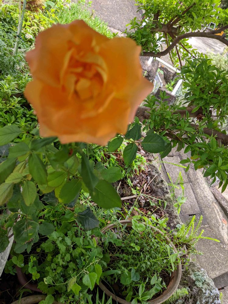 四季咲き性薔薇。切り戻しの効果ありです。陰に移動しています。木漏れ日が少し当たる場所より🌞🤔