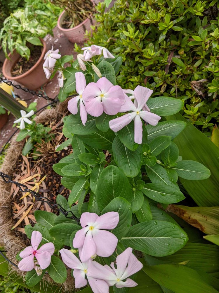 ハンキング〜日々草。液体肥料あげてないから、色が、ぱっとしてないけど、前より元気になりました。株も太りだしましたょ!🌞😂🙀😅