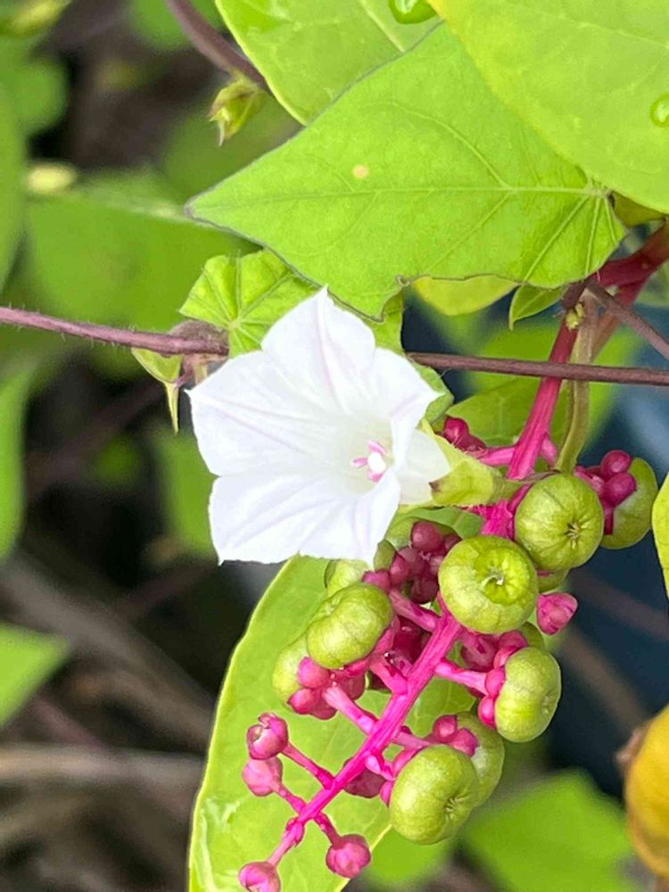 小さなマメアサガオの白がヨウシュヤマゴボウのビビットなピンク色とコラボしていい感じ💖