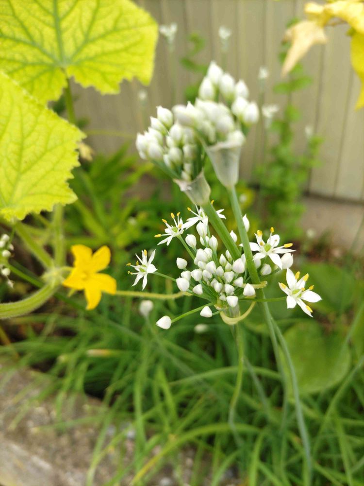 きゅうりのかわいいお花がまた咲き出し片付けれない🤣ニラのお花と仲良し🤗こっち向いて🎶ハイ💓チーズ📷