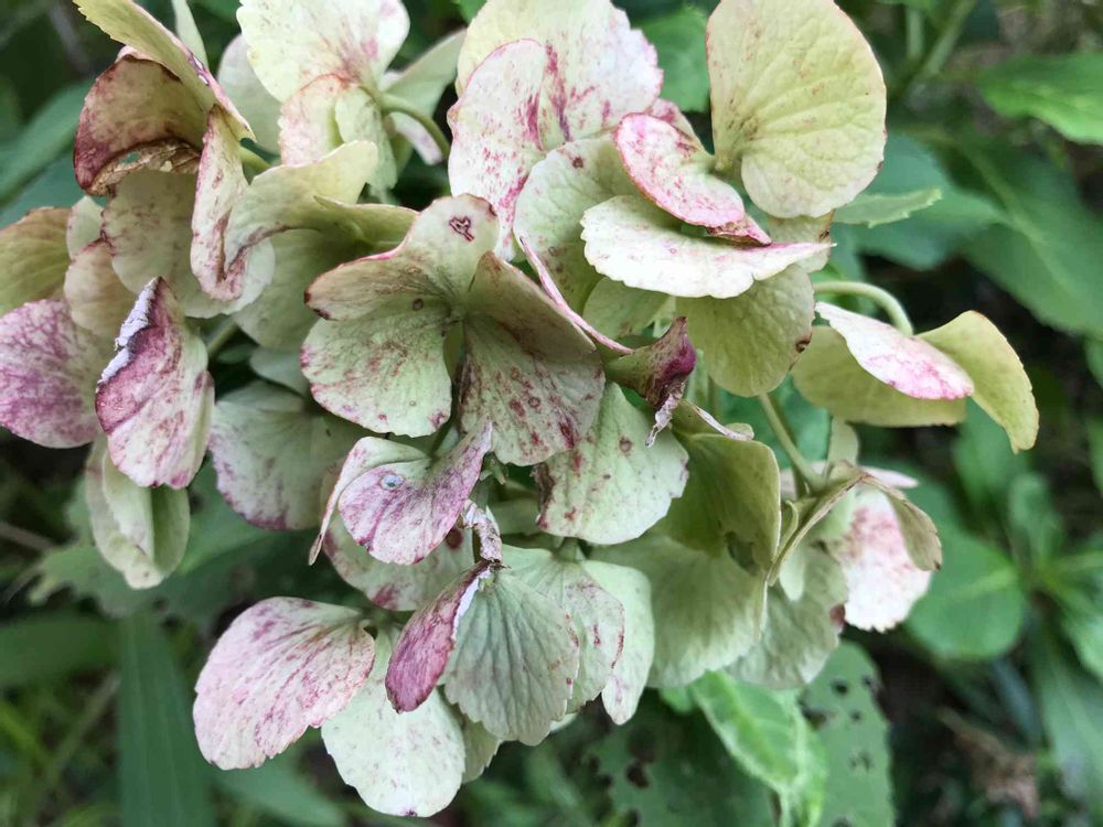 散歩の道端。ひと夏咲き続けた紫陽花、陽射しと風雨に晒されて 寂びた風情を見せています。