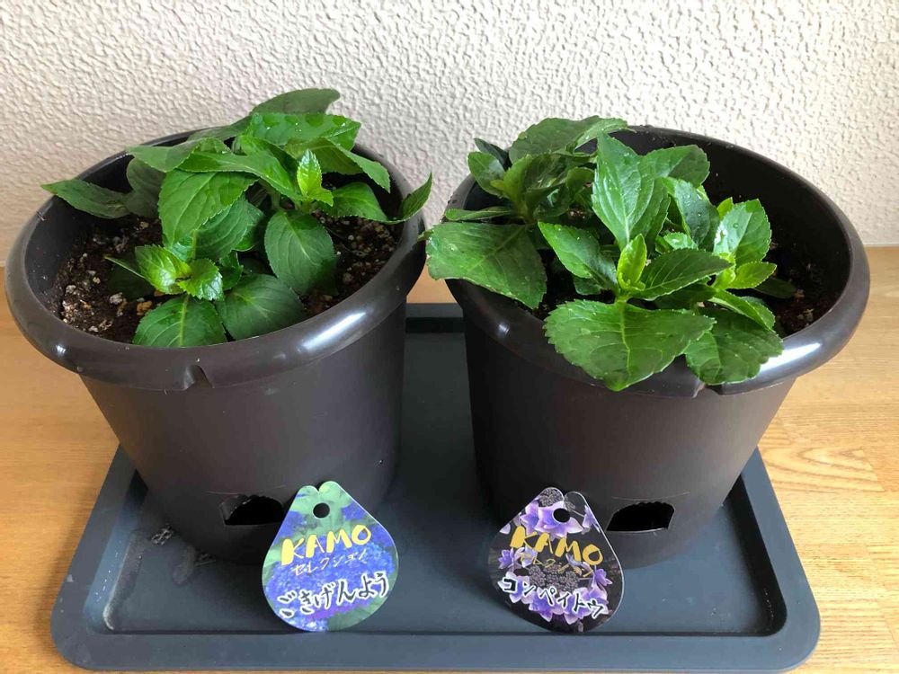 苗2株とアジサイ園芸店が使用している土と底面給水鉢がセットです