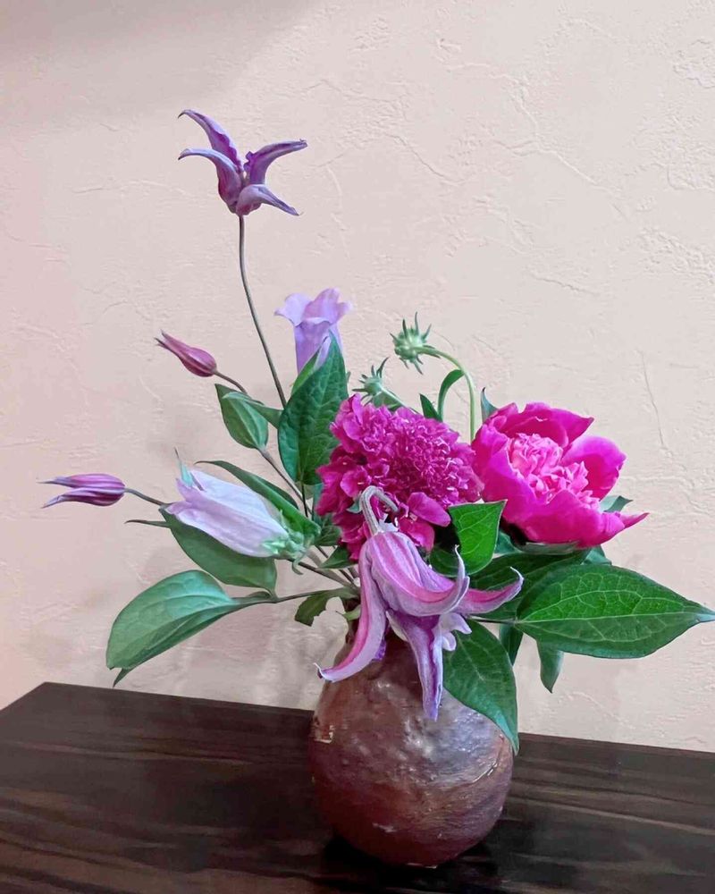 紫ピンクの色合いや、クレマチスの高低差、バラエティ豊かな花形・・