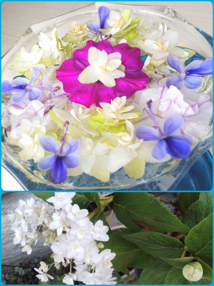 遅咲き、タマアジサイが咲き始めたので、ペチュニア、ブルーウィングを浮かべました*°♡
