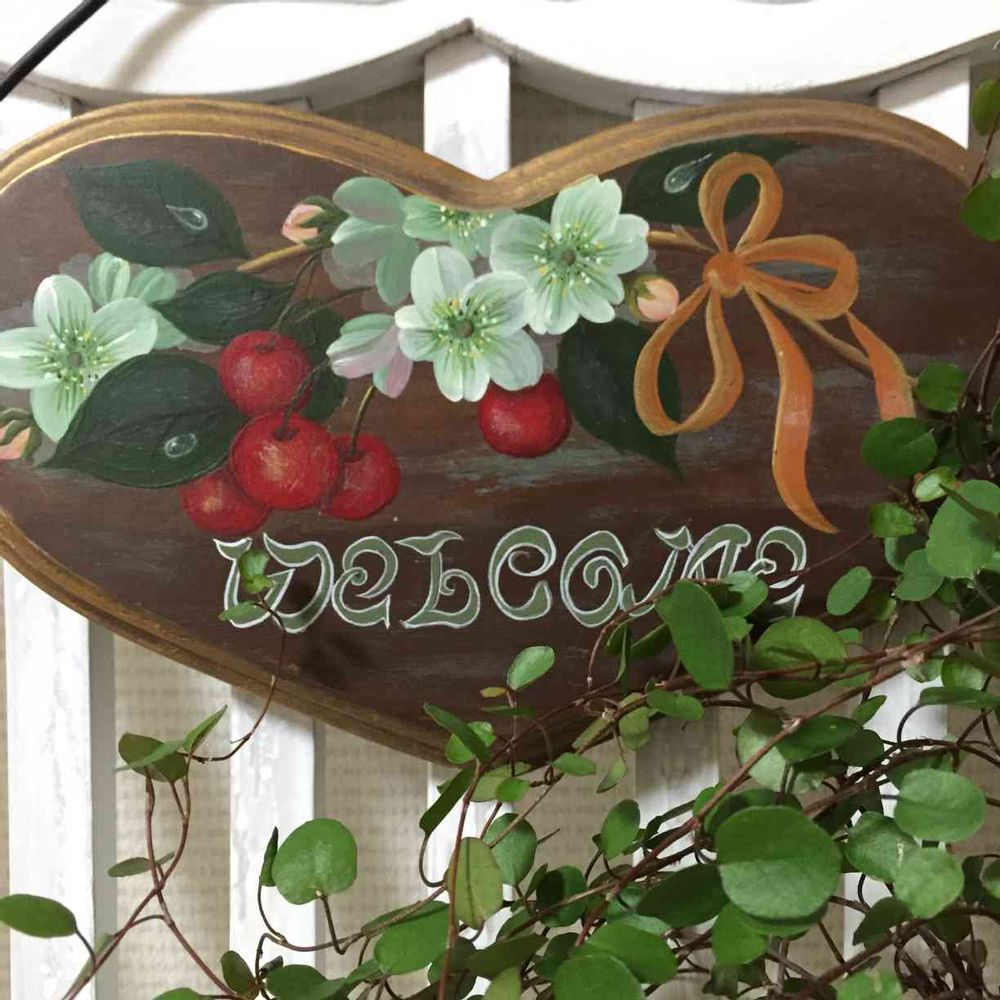 可愛らしいwelcomeボード💕サクランボの真っ赤が効いてるね🍒見ると、トールペイントやりたくなるわ😆素敵素敵♥