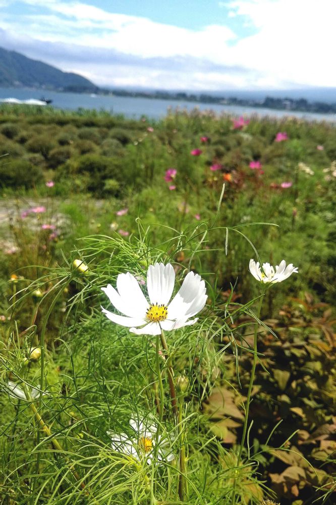 ハイキングコースのラストに出逢えた花は、湖畔にポツリと咲き始めた、真っ白なコスモスでした🌼🌼*・♪。.:*・゜