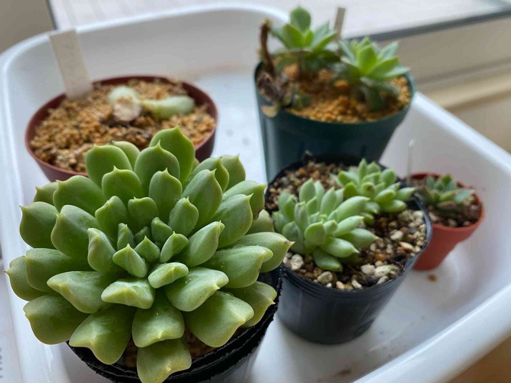 子株さんが窮屈そうだったのでやっとバラしました^ ^;成長点お亡くなりになってる親株は連日の雨晒しでパンパン、葉挿し取ろうとすると葉が千切れちゃうので少し乾燥させて植える予定。