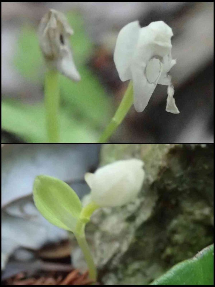 📚 📱 🖥️ 🌸は何れとも違うが、蕾の下部の苞と1枚の🍀(1cm強)は合致。側咢片と蕊柱(と思われる)は虫に食べられたか?菌栄養従属植物