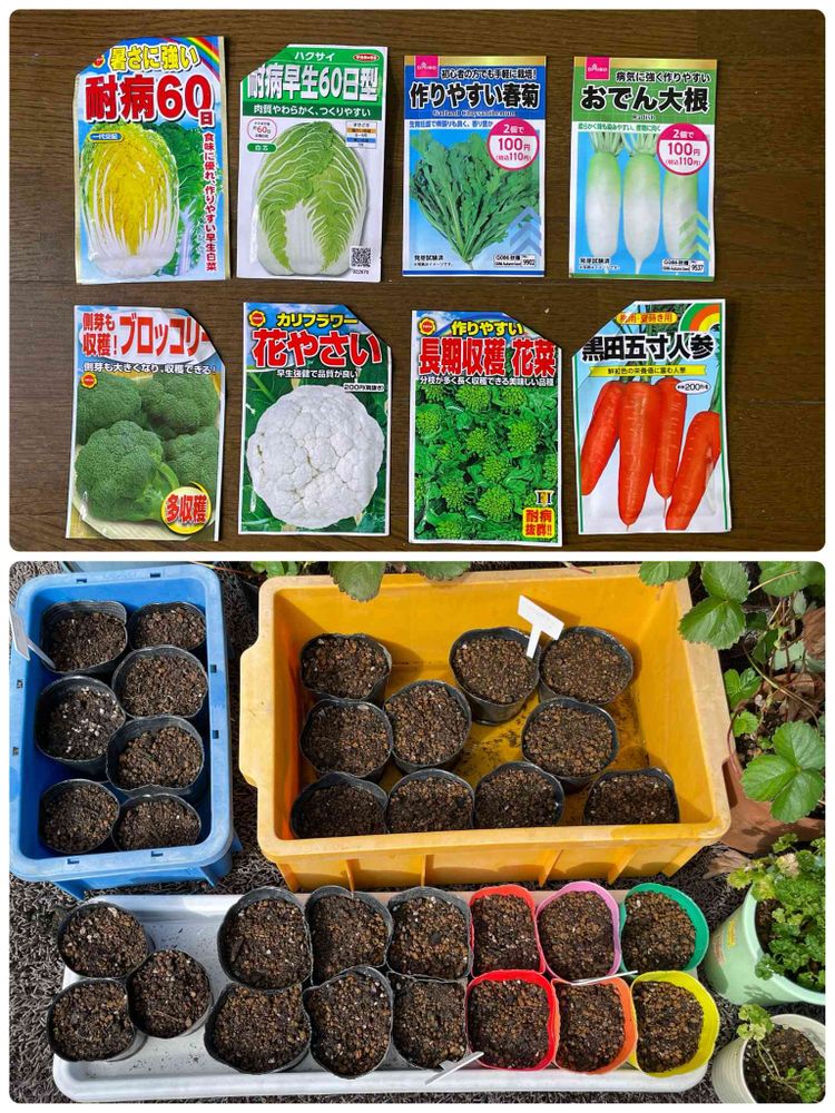 ポット植えは白菜2種各10ポット、ブロッコリー、カリフラワー各6ポット。