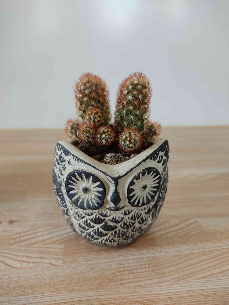 オザキフラワーパークで買ってきたフクロウの植木鉢&植えてあるのはコガネツカサです。頭からサボテンが生えているみたいで面白いです😆