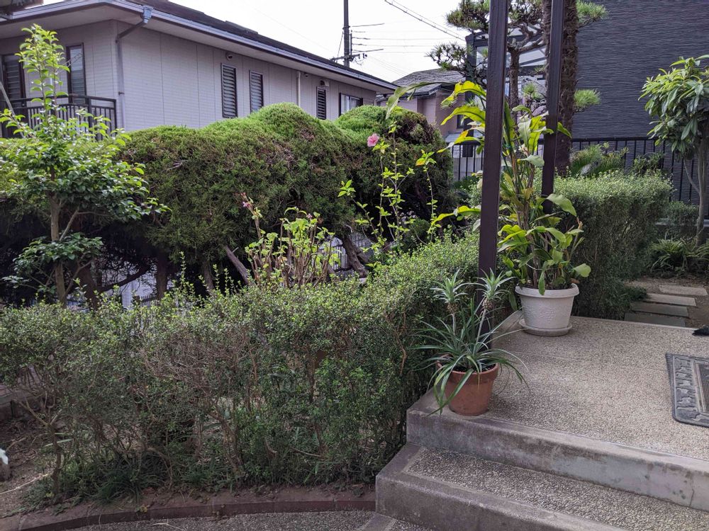 生け垣のカイズカイブキも50年!!寿命はとっくに過ぎし!!下の方は枝が朽ちてスケスケに…お陰で風通し最高やね✌️🥰