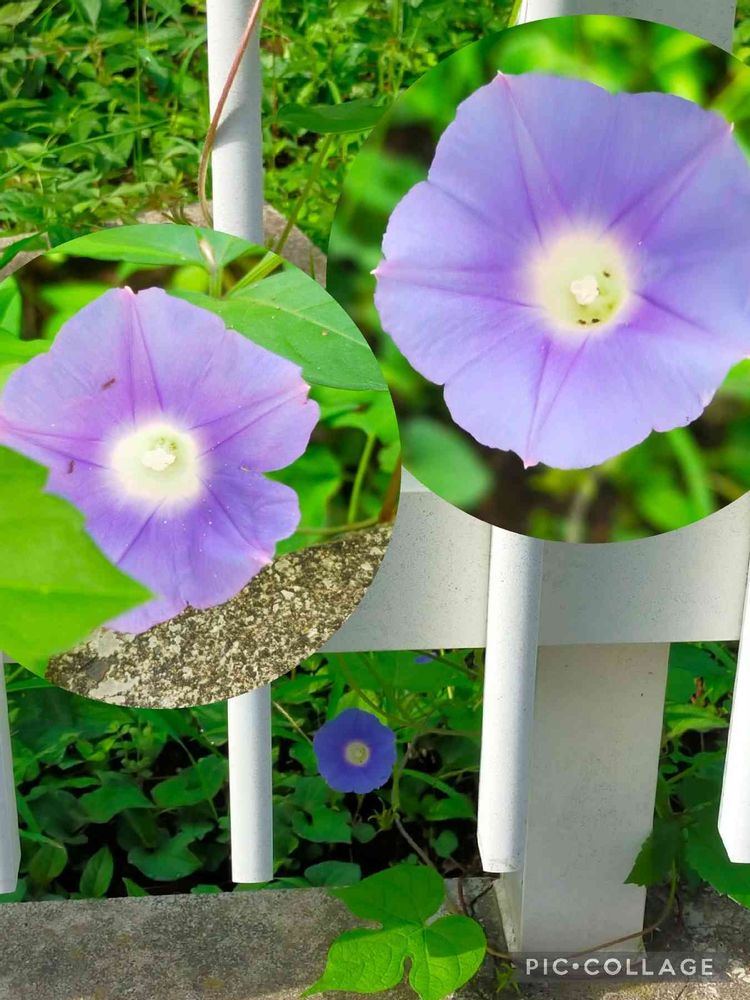 🐕の散歩道にある中学校の柵沿いの歩道で、小さな薄い青紫色のアサガオさんが、私に向かって『おはよう( ˶ᐢᗜᐢ˶)❤️』って😉