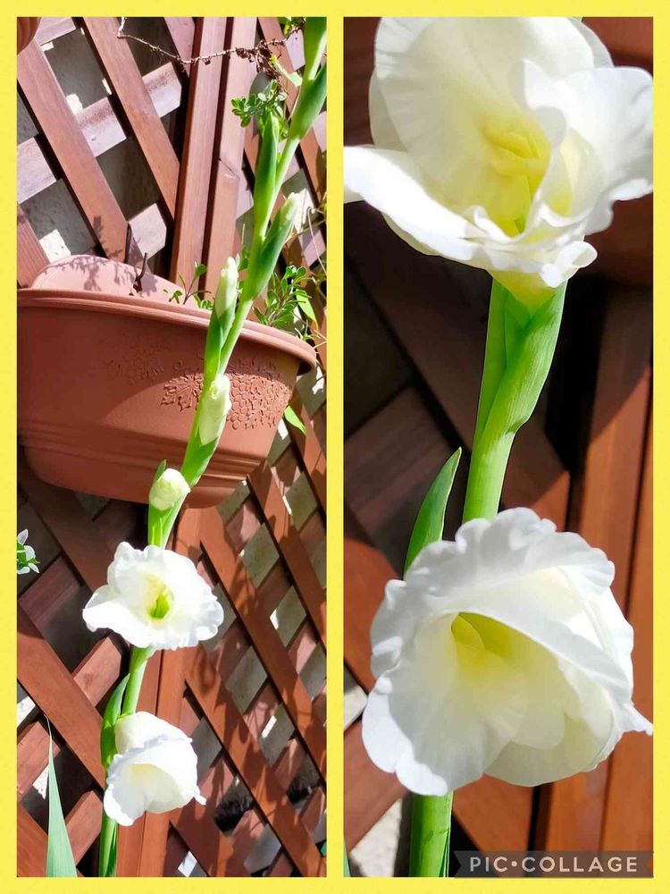白いグラジオラス、暑い時に爽やかさを求めて、3つの球根を植えたけど、2つは途中で枯れました😥