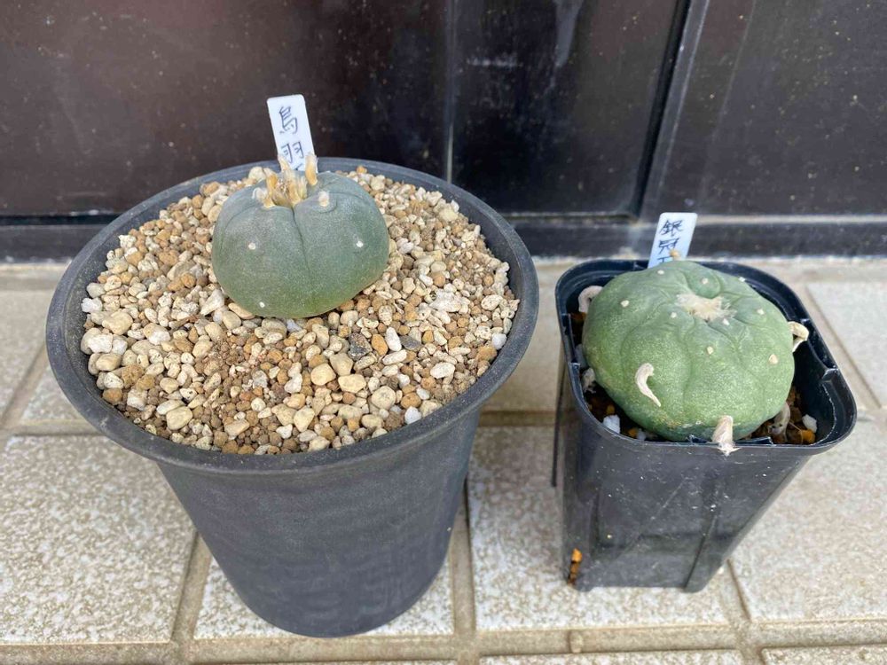 ネットでポチった烏羽玉(左)は、抜き苗で届いたので、空いてた鉢に植えてみた。