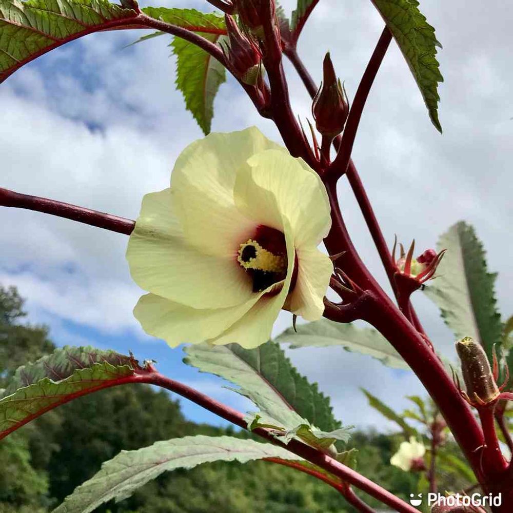 平日は出勤後にしか咲かないオクラの花🌼、こうしてよく観るときれい✨だなぁ😊。