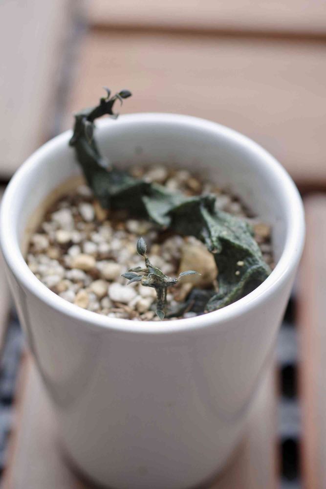 根腐れさせてしまい長さが半分くらいになってしまったセロペギア ポッセリさんですが、脇芽が出て、少しずつですが伸びていってます。