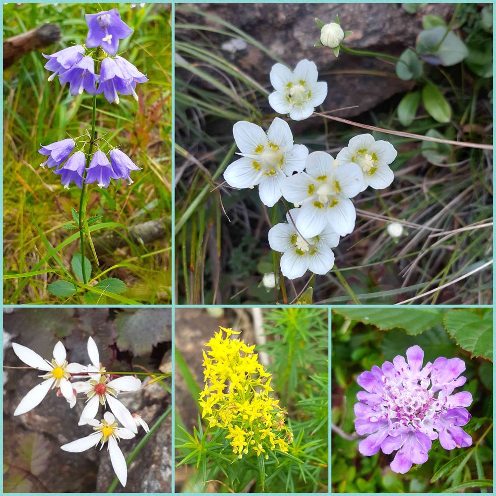真っ白なウメバチソウ、ベルのようなツリガネニンジン、小さなダイモンジソウ、秋色のコガネギク、ひときわ大きなお花のエゾマツムシソウ。