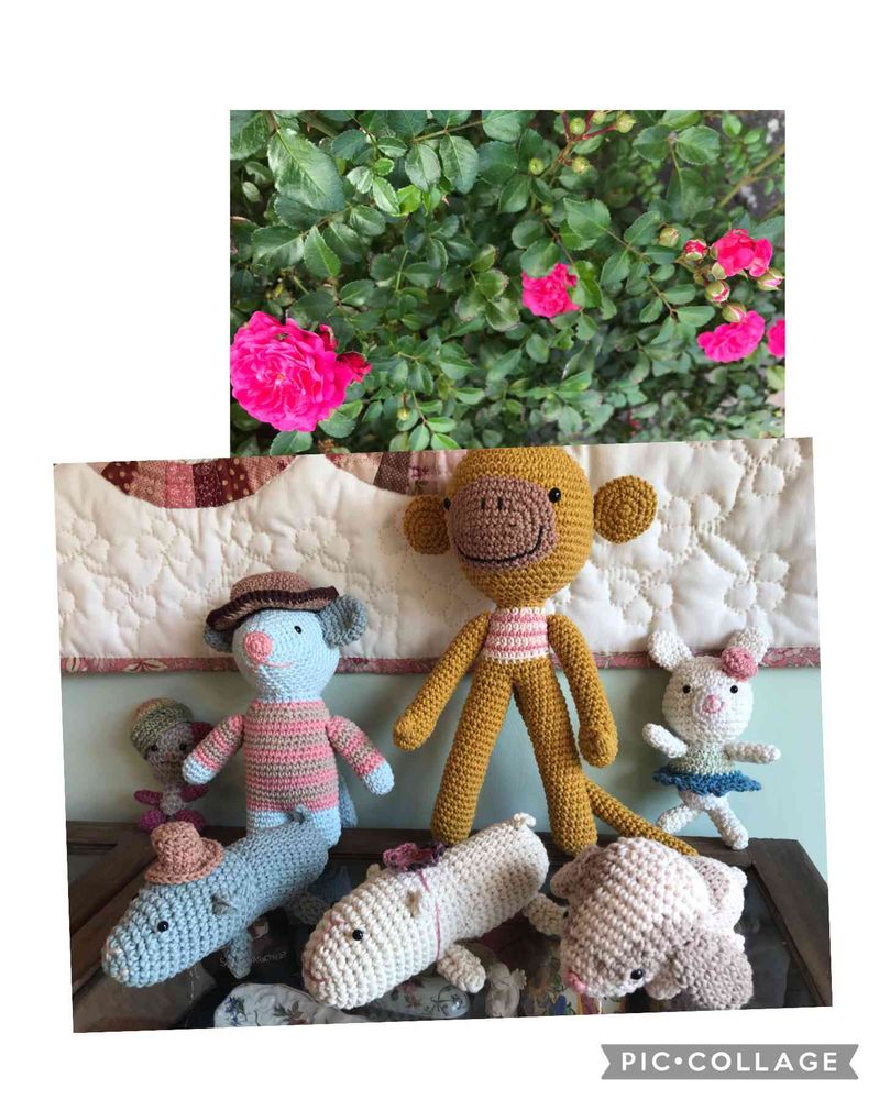 お猿さんのあみぐるみ作りました。尻尾がビョーンと長いんです。😉この子も妹に送ります。その前に集合写真🤳 ところでミニ薔薇もまた咲き出してきました。☺️