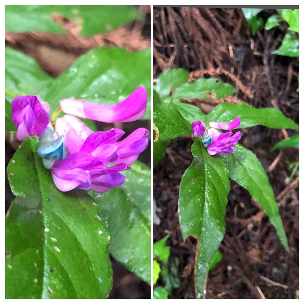 御岳山に登る途中でで咲いていました。お花は1センチくらいで葉は5センチくらい。紫の花の中に一つだけ青いのがあるのが不思議です。