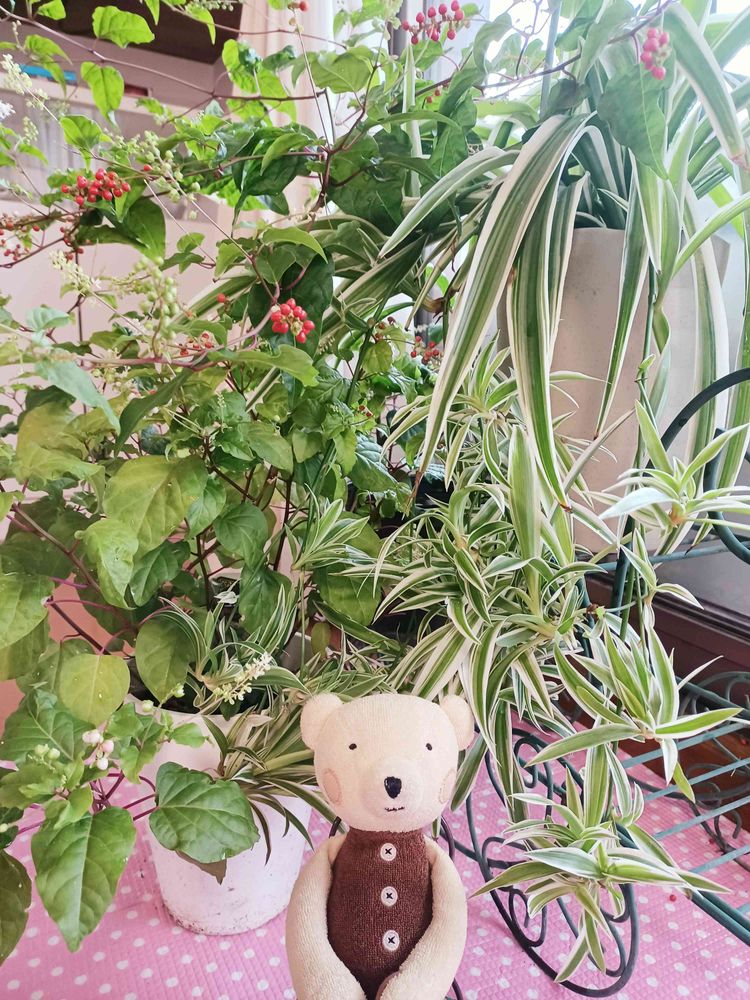 今年初めて花をつけたオリヅルランは、こんな風に子株がたくさん育っており、うちのリンカさんも嬉しそうです。