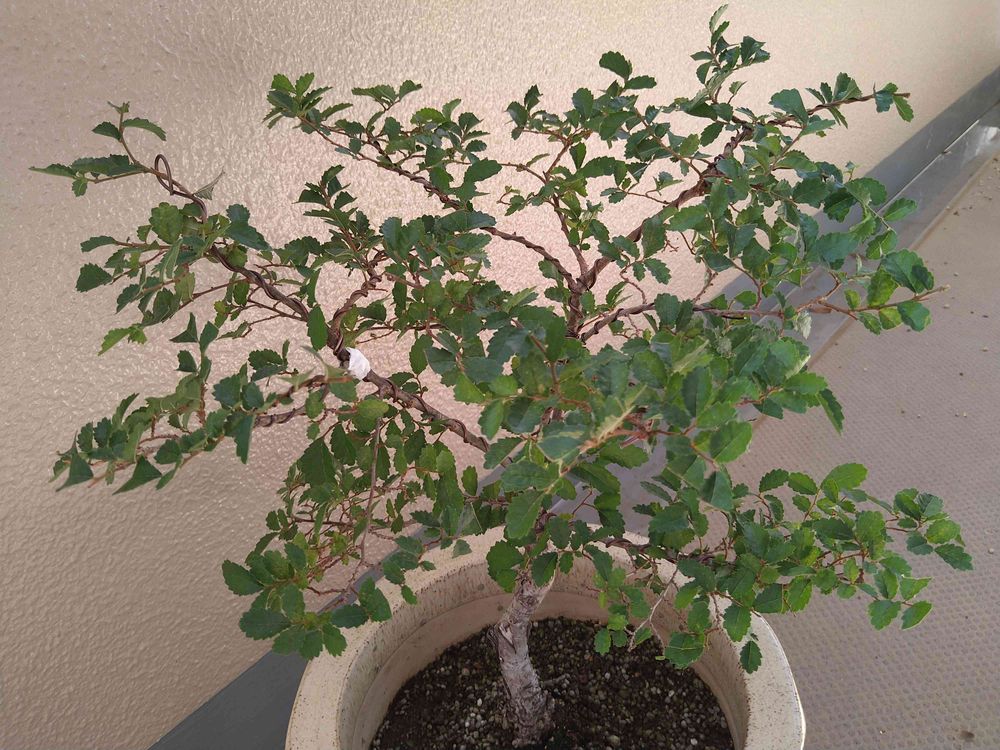 そのニレケヤキに初めて針金かけを行った。真っ直ぐ棒立ちの枝にも優しく曲をつけてみた。左の枝にテーピングテープが見えるのは、枝を曲げてる最中にグキッと手応え。折れてはいないが骨折か。