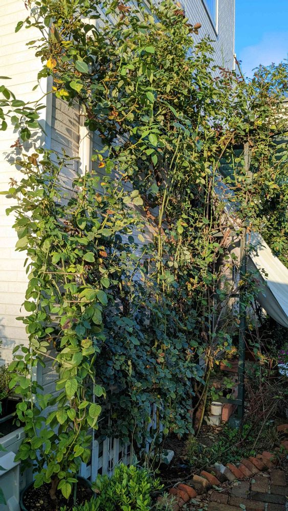 この先の台風シーズンに備えて、つるバラも枝を整理しました。