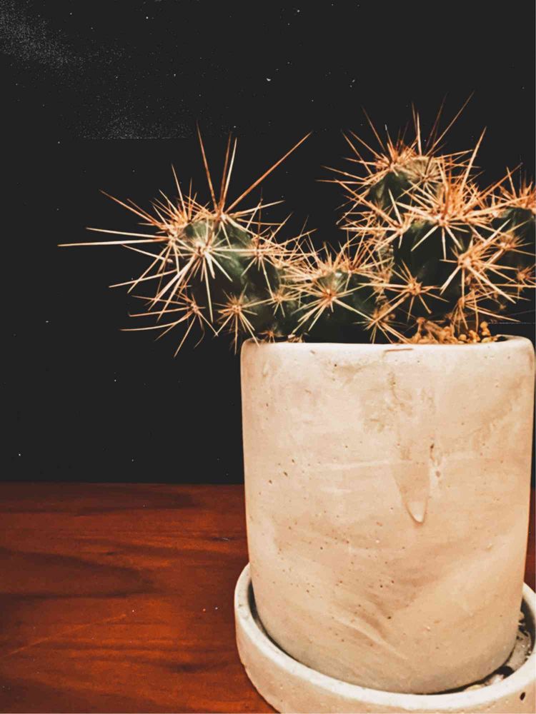 幾何学な感じのサボテン セメント鉢に入れてみる。 刺さる!!!痛い!!!