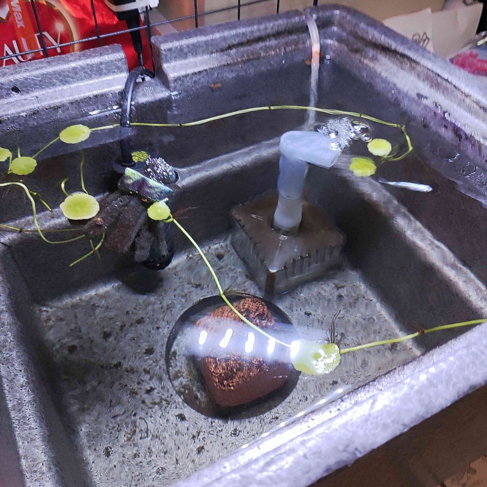 おはようございます‼️この発泡スチロールの容器はよく出来ていますね。室内で飼っておられるのですね。私も 室内外で たくさんのメダカを飼っています。この容器も2個室外にありますが、底に赤玉土を敷き、真ん中に水生植物の鉢を沈めて、エアレーションはなし。稚魚(針子)用に活用しています。室内水槽はそれぞれ タイマーで照明器具を調整し(昼間10時間点灯) 夜中は静かに眠らせてやっています。やはり人間と同じ生活は酷なのかましれませんね。あと1匹大事にしてあげてください‼️