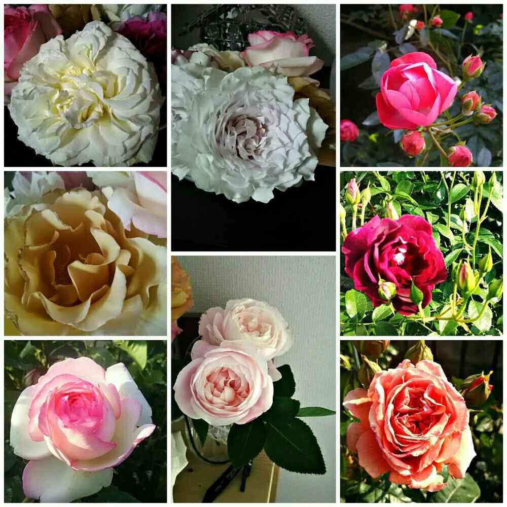 今日と昨日から開花した薔薇たち❤凄い強風と突風で先程から雨も😱今日は枝を麻紐で支柱に纏める作業を。今は蕾が沢山で穂先が重たくて強風で倒れてしまう😢