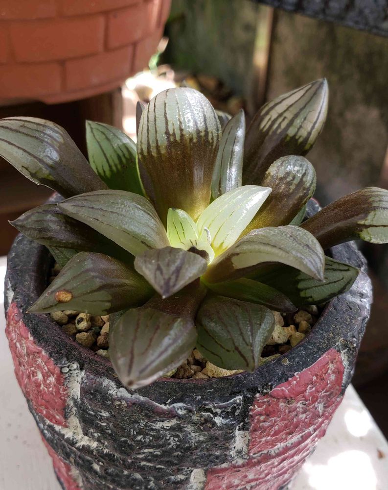 消毒した際、成長点にダメージがあったのかそこが枯れて成長しないオブジェに変身していたのですが、約1年ぐらいしてその近くの葉の脇から新芽が出てここまで大きく復活してくれました😆