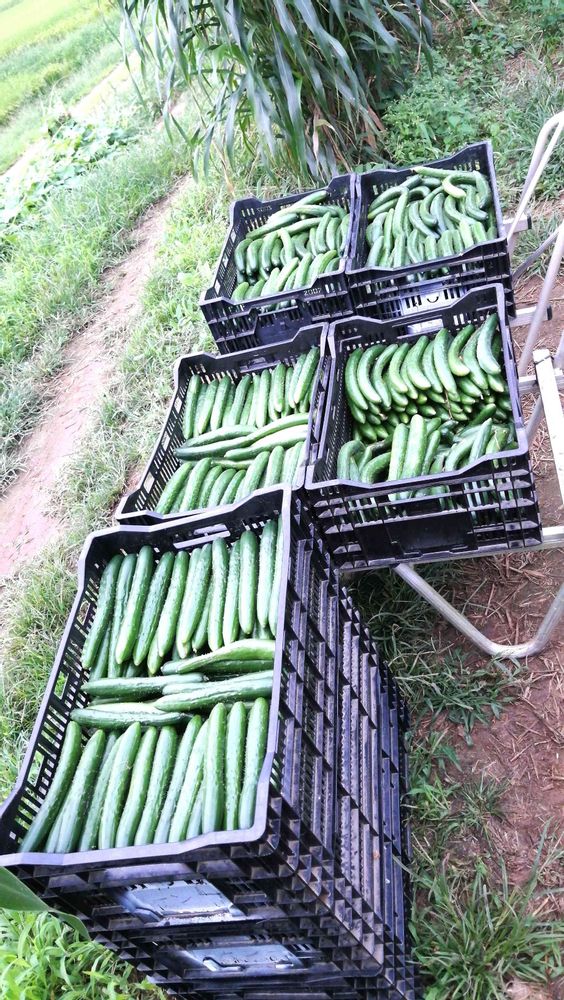 真っ直ぐのはコンテナにみっちり詰められるんですね。曲がっているって言ってるキュウリもほぼ真っ直ぐだと思える出来栄えだと思います💦