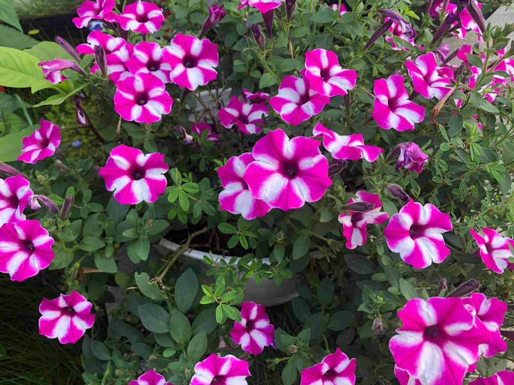 カインズで買ったあふれ咲きペチュニアラズベリージャム🌸雨にも負けずたくさん咲いてくれました!挿木もはじめてやったけど成功🤗花柄摘みもしなくて手のかからない良い子でした💓ただ、茎がベトベトしてるのが苦手😭次はないかもなあ…。