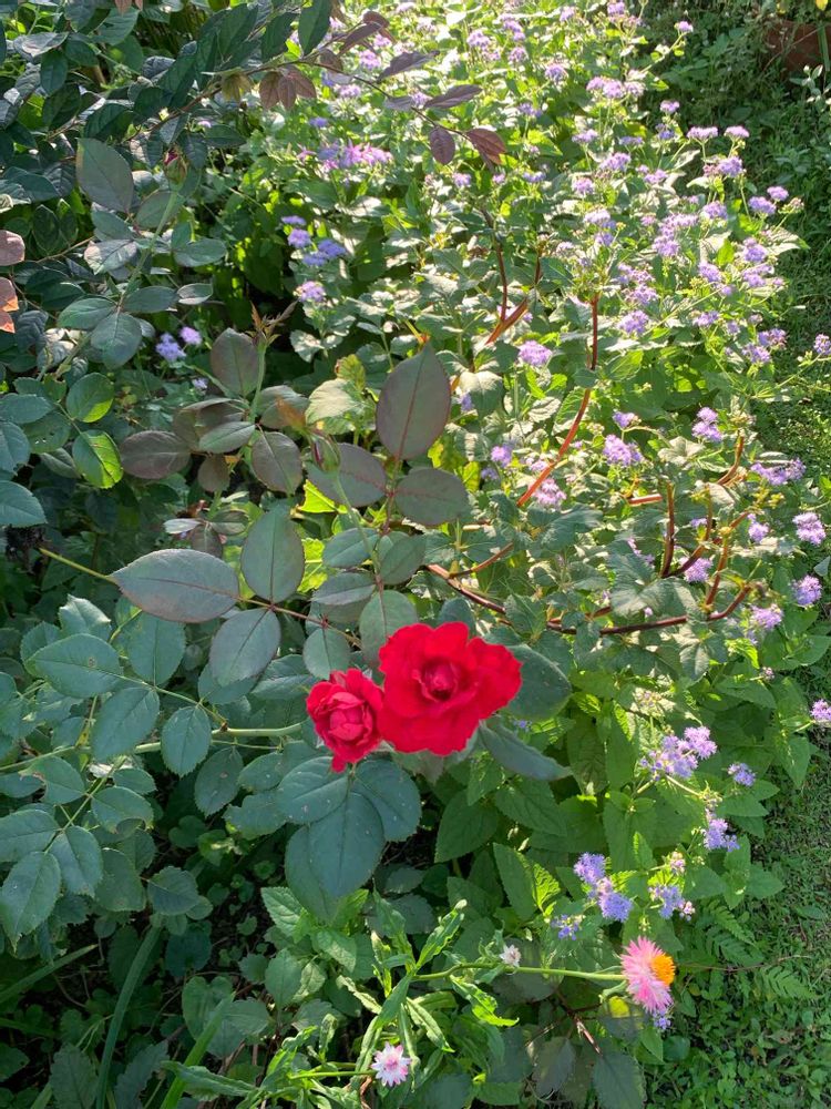 赤いバラと紫の花