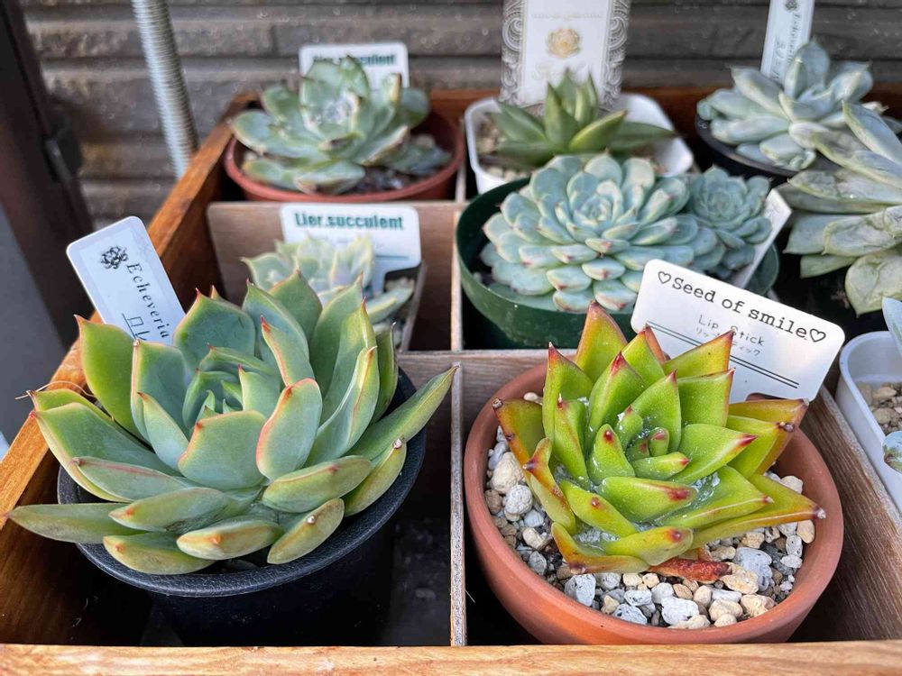 夏は少し焦げやらシワやらあった多肉棚最前列のおふたりさん。暑さが和らいできたせいか調子戻ってきたみたい