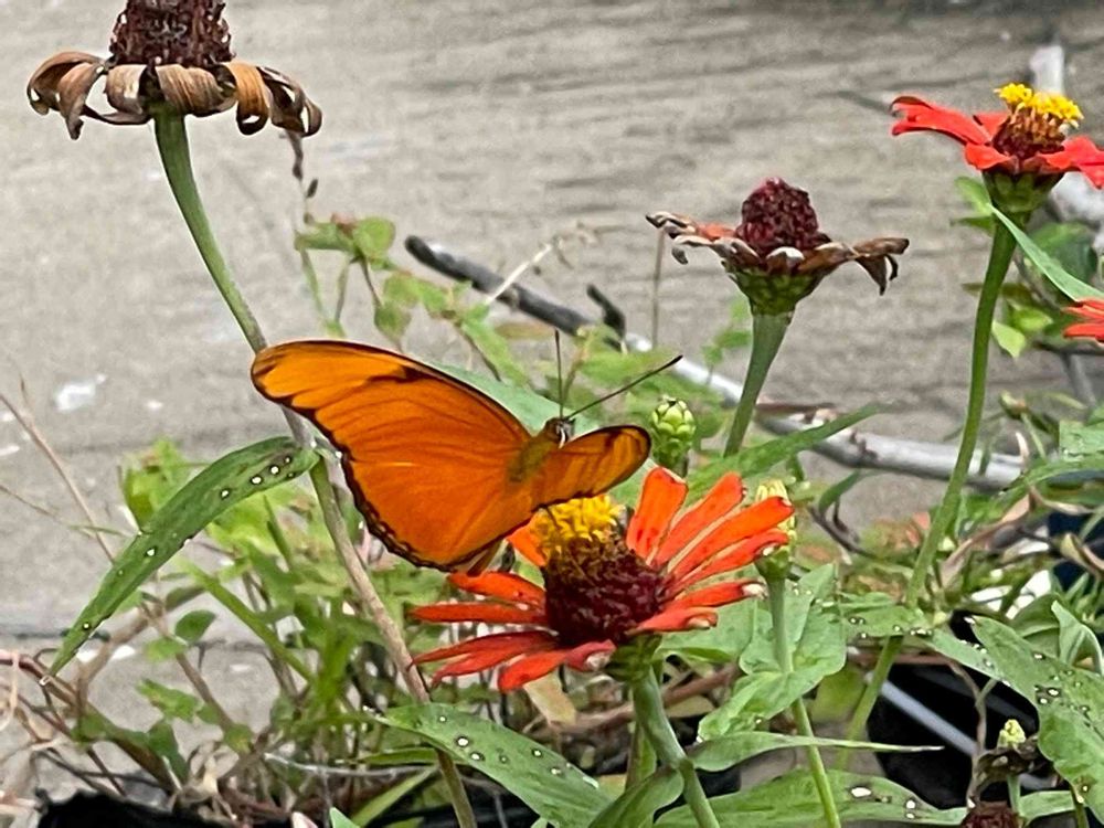 ジュリアバタフライと言う蝶です。百日草Zinniaの蜜を吸いにやってきました。南北アメリカ大陸にいるそうです。
