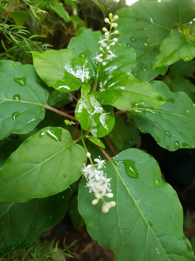 へ 私は植えた覚えがありませんが、、、ただだいぶ離れた所にジュズサンゴがありました。こちらは日陰で今頃花が咲いたのかm(__)m
