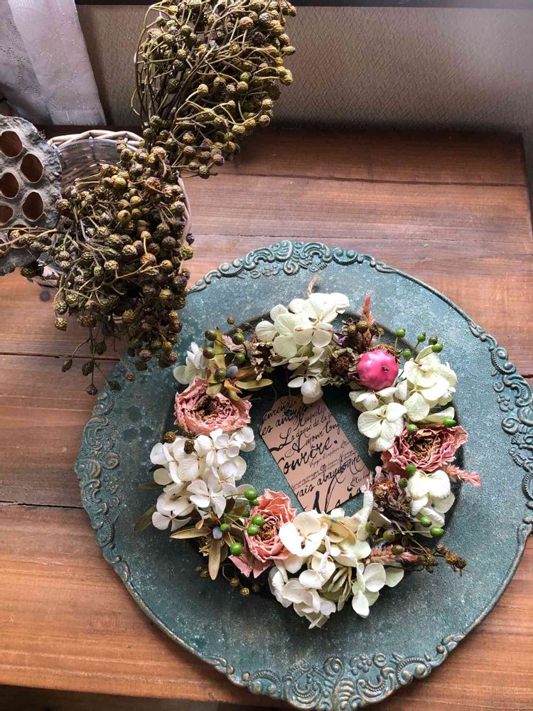 おはようございます😃昨日から作り始めています❣️紫陽花とバラのリース