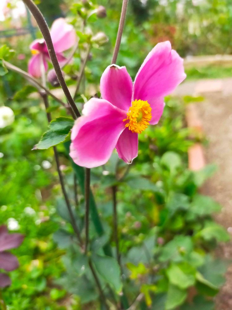 風もやみ、穏やかな朝となりました。秋らしく秋明菊が咲きました。まだ夏の花も咲き夏と秋が一緒の庭です😊