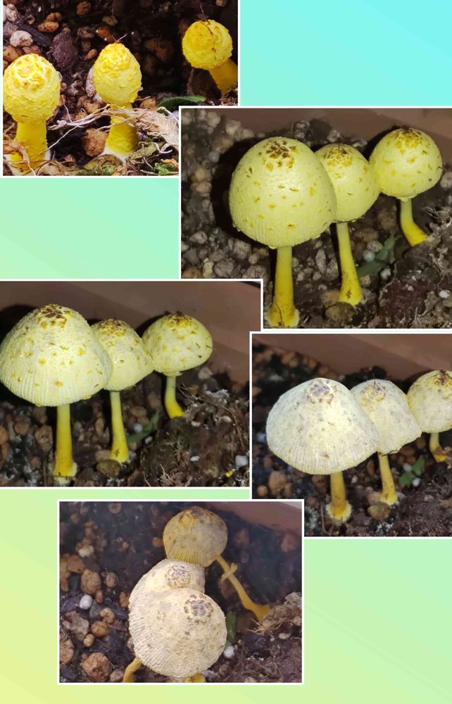 黄色のキノコが生えてきたの驚き、パンパンに膨らんですぐにしおれて……。凝縮した一生でした。